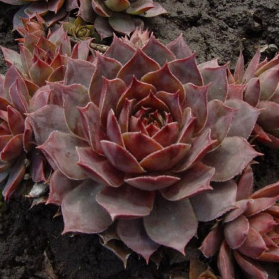 Молодило Walcotts Variety - очень красивый почвопокровный многолетник. Отличается весьма необычным окрасом листьев. Листья пурпурные с серебристо-зеленым оттенком по всей площади каждого листочка.