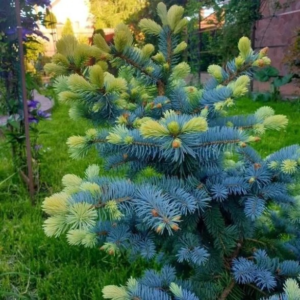 Ель колючая голубая Нимец (Picea pungens Nimetz) – это очень маленькая ель, вырастающая к 10-ти годам около одного метра с диаметром кроны до 70 см. Хвоя ярко-голубая. Её стальную хвою великолепно весной оттеняет прирост яркого, кремово-белого цвета, которая добавляет декоративности. Любоваться этим великолепием можно около двух месяцев. Цвет держится до середины лета, а затем оттенок прироста начнёт изменяться, постепенно сливаясь с голубой хвоей предыдущего года.