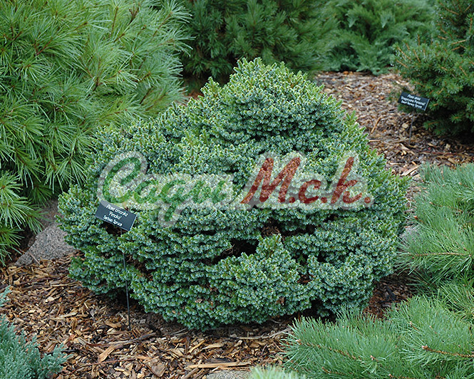Карликовая ель. Крона плотная, неправильная, со временем принимает плоско-сферическую, слегка конусовидную форму. Растёт до высоты 90 см и диаметра 180 см. К 10-ти годам высота 30 см и диаметр 50 см. Хвоя короткая, весной серебристо-голубая, затем постепенно окрашивается в стальной цвет. Идеальный сорт для небольших приусадебных участков, альпинариев. Место солнечное или полутенистое. Почва умеренно плодородная, умеренно влажная. Зона 3 (до -34º).