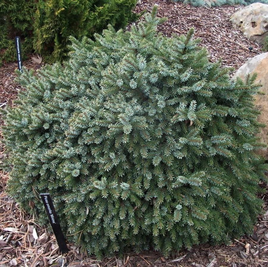 Ель сербская Minima — эта карликовая форма, ее высота не превышает 20—25 см, а диаметр кроны около 0,5 м. Растет медленно, в год прибавляет 3—4 см. Побеги очень короткие, жесткие, сильно ветвящиеся. Одни отходят от центрального побега практически горизонтально и лежат на земле, другие под разными углами направлены вверх. В результате формируется компактная, плотная, очень густая крона округлой или уплощенно-шаровидной формы. Хвоя блестящая, жесткая, колючая, короткая (не более 1 см), очень густо сидящая на побегах. Сверху хвоинки зеленые, снизу серебристо-голубые.Молодой прирост ярко-травянисто-зеленый.