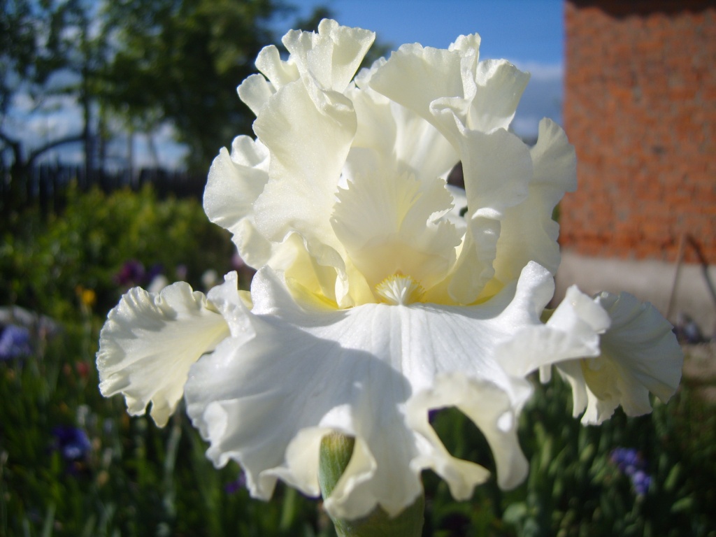 Ирис Devonshire Cream- высокий, бородатый сорт ирисов. Сильно гофрированный, бело-кремовый с лимонными пятнами в основании стандартами. Бородка желтая. Легкий пряный аромат. Высота куста 95 см Срок цветения поздний.