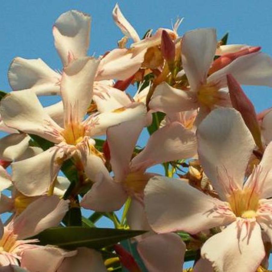 Олеандр обыкновенный Талия (лат. Nerium oleander Thalia) цветет потрясающими многочисленными простыми цветками кремового окраса с оттенками розового и желтого цветов. Основание цветков желтое, тычинки красные. Сорт отличается приятным ароматом. Внимание! Олеандр - ядовитое растение, поэтому при его культивировании требуется осторожность.